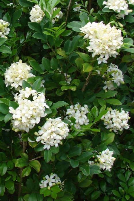 Murraya paniculata, commonly called orange jessamine, is a small, tropical to subtropical tree or shrub that may grow to as much as 20′ tall, but is usually found much shorter (8-12′) and can be pruned as a formal hedge to as little as 2-3′ tall. It is noted for its glossy evergreen dark green leaves, strongly fragrant white flowers and red ornamental fruits. It is native from China and India to Australia. Each odd-pinnate leaf typically has 3 to 9, ovate, glossy, dark green leaflets (to 2.5″ long). Fragrant white flowers (each to 7/8″ across) in terminal or axillary cymes bloom several times throughout the year. Flowers are most fragrant at night. Flowers are followed by ovoid, red fruits (each to 1/2″ long), each with 1-2 seeds. Plants may display flowers and fruits at the same time. Flowers have the scent of orange blossoms, hence the common names of orange jessamine and mock orange that are sometimes applied. Synonymous with Murraya exotica.